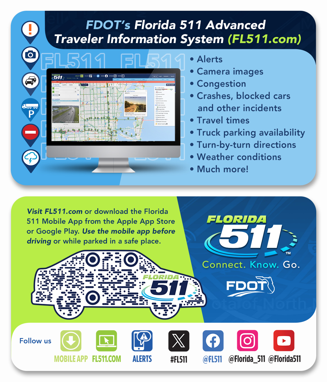 PRINT & OUTREACH DIGITAL MATERIALS Public service announcement (PSA) in various sizes. Suggested usage: place in newsletters, magazines, newspapers and other relevant printed or electronic media. FL511 TIP Card 3.5″ x 2″ inches Download PDF Poster – Vertical 8.5 x 11 inches Download PDF Poster – Horizontal 11 x 8 inches Download PDF Banner 24 x 6 inches Download Full Page With Bleed 8.5 x 11 inches Download PDF Full Page No Bleed 8.5 x 11 inches Download PDF popdevteamPrint Outreach Digital Materials06.08.2018