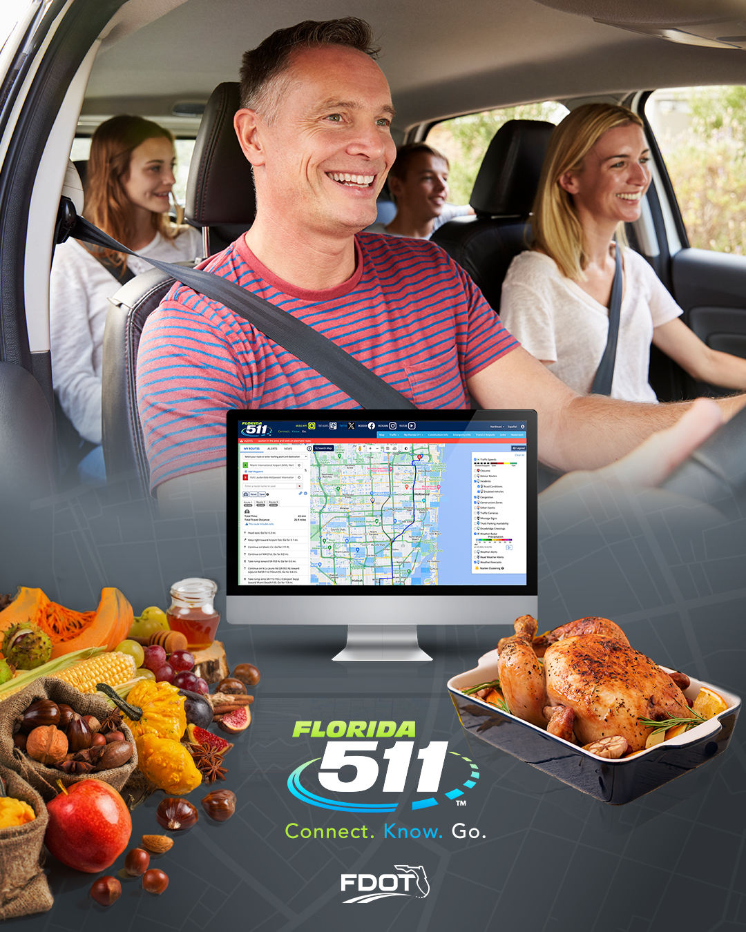 Many Floridians will hit the road to spend time with loved ones this Thanksgiving. Be sure to drive with extra caution, buckle up, and never drive impaired. Before you head out, use #FL511 for directions and real-time traffic information, including incidents and travel times.